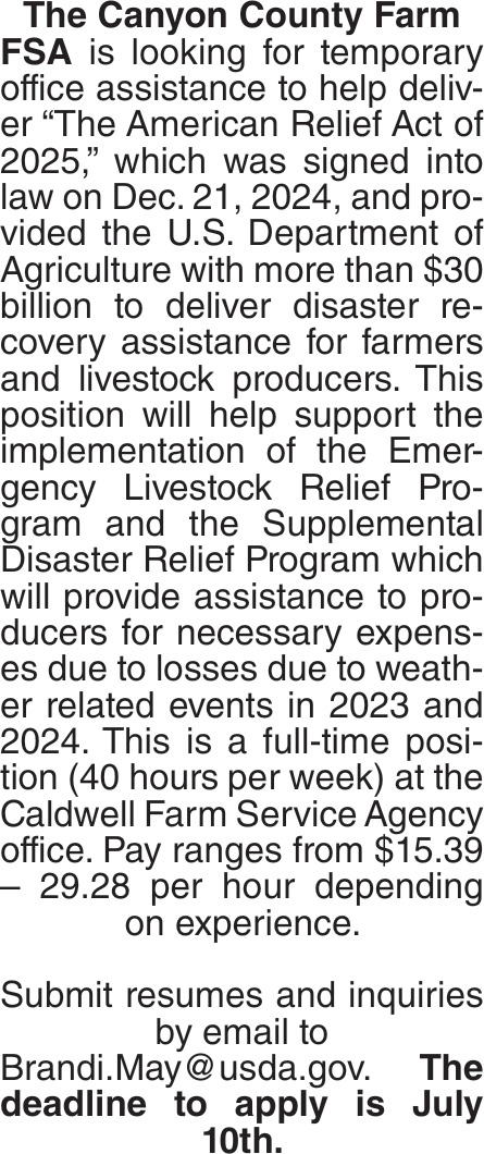 The Canyon County Farm FSA is looking for temporary office assistance to help deliver "The American Relief Act of 2025,"which was signed into law on Dec. 21, 2024, and provided the U.S. Department of Agriculture with more than $30 billion to deliver disaster recovery assistance for farmers and livestock producers. This position will help support the implementation of the Emergency Livestock Relief Program and the Supplemental Disaster Relief Program which will provide assistance to producers for necessary expenses due to losses due to weather related events in 2023 and 2024. This is a full-time position (40 hours per week) at the Caldwell Farm Service Agency office.