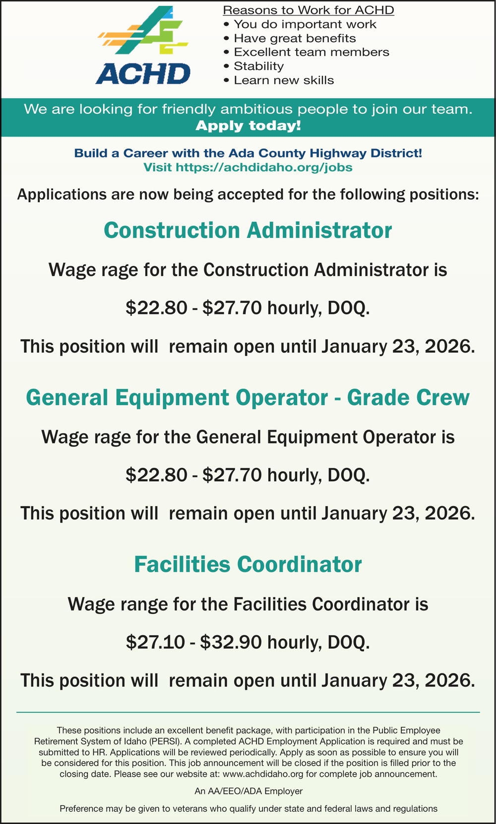 These positions include an excellent benefit package, with participation in the Public Employee Retirement System of Idaho (PERSI). A completed ACHD Employment Application is required and must be submitted to HR. Applications will be reviewed periodically. Apply as soon as possible to ensure you will be considered for this position.