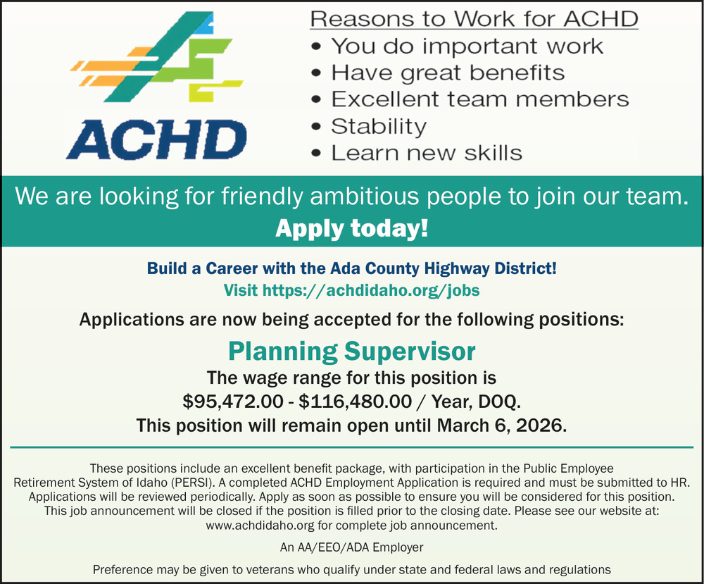 These positions include an excellent benefit package, with participation in the Public Employee Retirement System of Idaho (PERSI). A completed ACHD Employment Application is required and must be submitted to HR. Applications will be reviewed periodically. Apply as soon as possible to ensure you will be considered for this position.