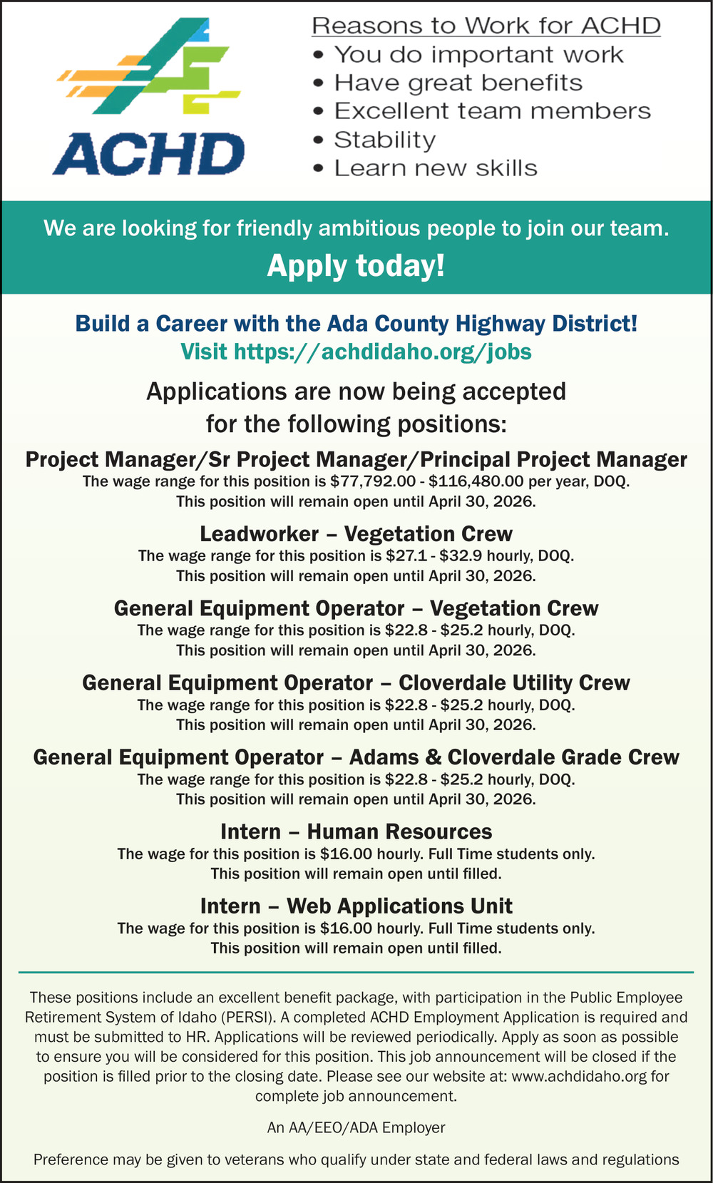These positions include an excellent benefit package, with participation in the Public Employee Retirement System of Idaho (PERSI). A completed ACHD Employment Application is required and must be submitted to HR. Applications will be reviewed periodically. Apply as soon as possible to ensure you will be considered for this position. This job announcement will be closed if the position is filled prior to the closing date.